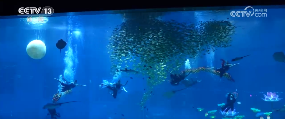 在深圳,当地海洋馆将非遗沙头角鱼灯舞搬进水下,水下表演传递了别样的国潮风情,也让游客有了一份独特的仪式感。