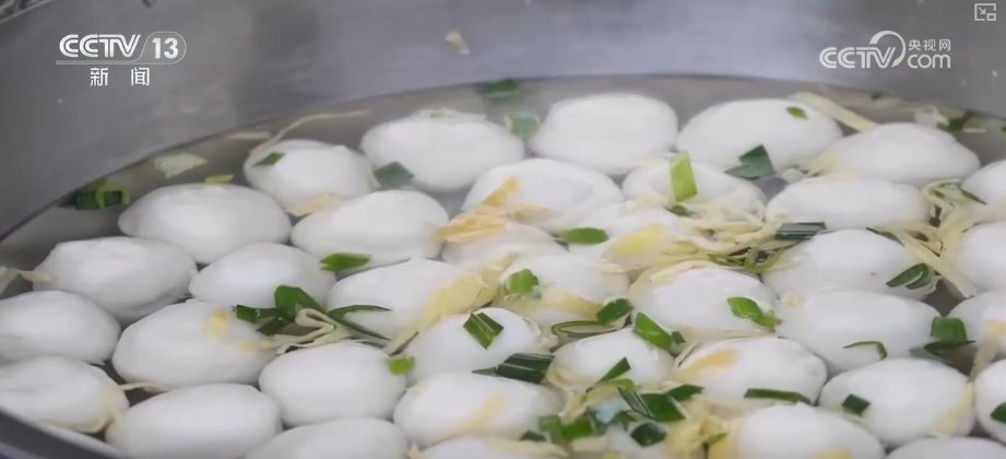 现在,当地很多的村民会利用“桑基鱼塘系统”内的食材做出当地特色美食。比如这个叫作桑叶糕,它是带着一种桑叶清雅的香气。还有这里的鱼圆,也是当地特色的美食,咬起来爽滑弹嫩,欢迎大家到现场品尝。