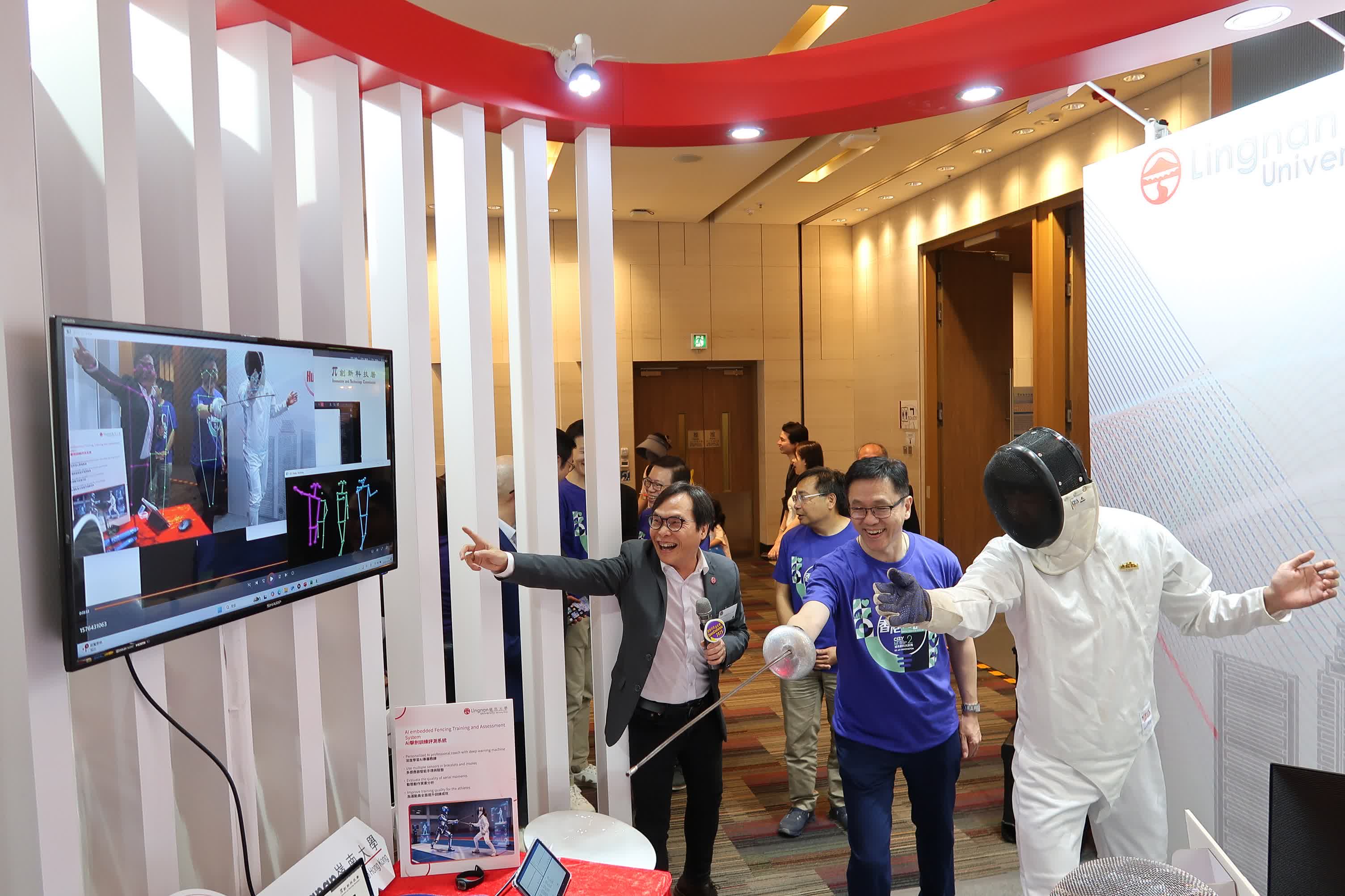 特區政府創新科技及工業局局長孫東參觀嶺大展區時,嶺大協理副校長(策略型研究)鄺得互介紹其與深圳大學周宇教授共同研發的「AI專業劍擊訓練系統」項目,該系統充當一位「AI私人教練」,透過結合智能手環、智能鞋墊和動作感應攝影鏡頭,即時觀察和分析劍擊運動員的動作質素,幫助運動員進行科學訓練,提升安全性和效率。