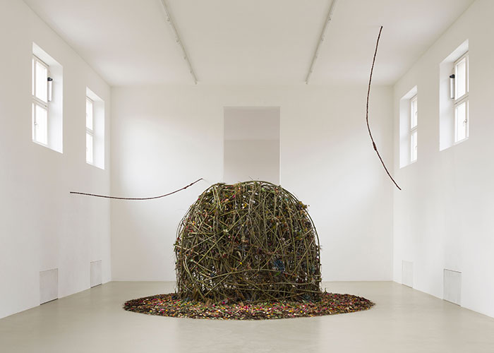 大坪光泉,《慕尼黑林伽》,2025年,柳枝、金属框架、废弃金属、蜡烛、土、各种花卉和树叶,250×300厘米。克里斯琴·光云·厄尔布尔·奥尔德姆, 《日期线》,2025 年,避雷针、美珠椰枣,尺寸可变。摄影:马克西米利安·戈伊特。艺术家和慕尼黑艺术协会(慕尼黑)惠允。