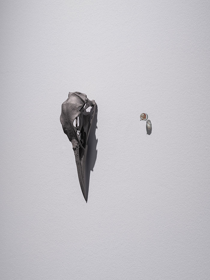 刘帅,《鸟巢和鸟冢的距离是一棵树·之二》,2025年,废弃鸟巢的枝条、鸟骨、玻璃球、羽毛等。艺术家惠允。嘉源海美术馆供图