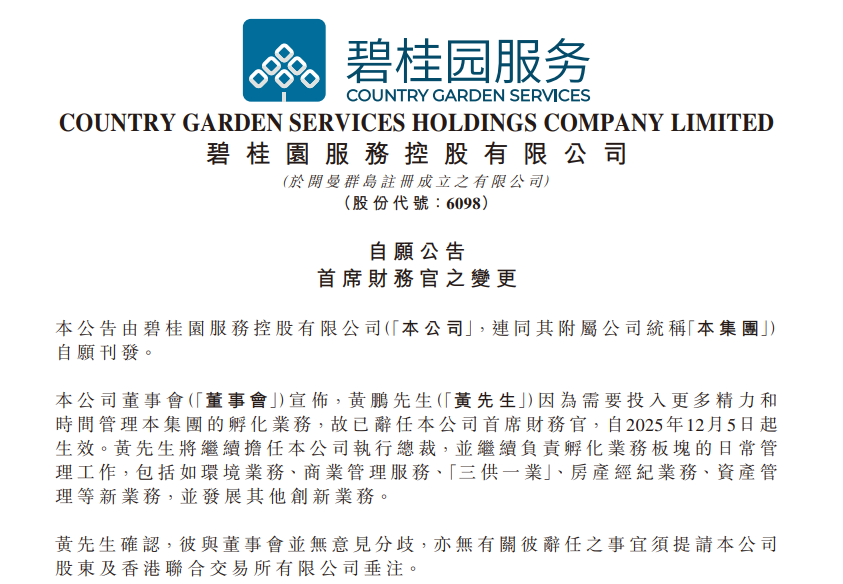 乐居财经 李兰12月7日,碧桂园服务(06098.HK)发布公告,黄鹏辞任公司首席财务官一职,以投入更多精力管理集团的孵化业务。