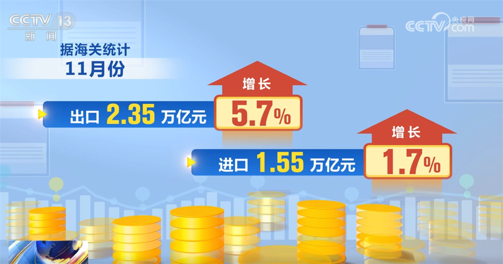 11月份,我国外贸增速回升,进出口3.9万亿元,同比增长4.1%。其中,出口2.35万亿元,增长5.7%;进口1.55万亿元,增长1.7%。