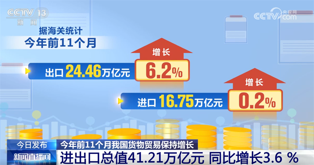 央视网消息:海关总署12月8日对外公布,今年前11个月,我国货物贸易保持增长,进出口总值41.21万亿元,同比增长3.6%。