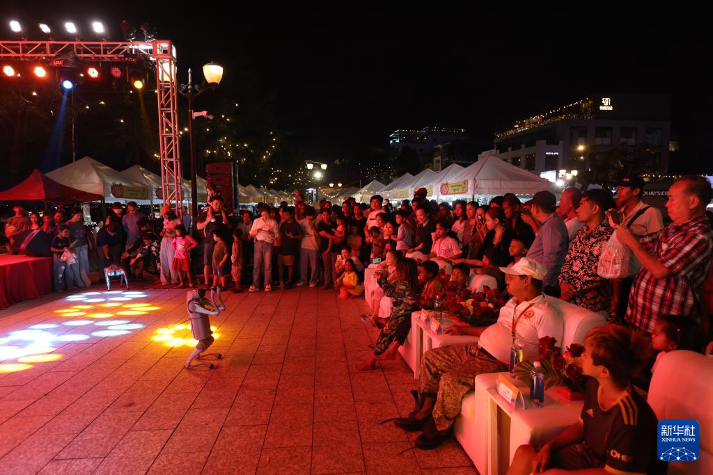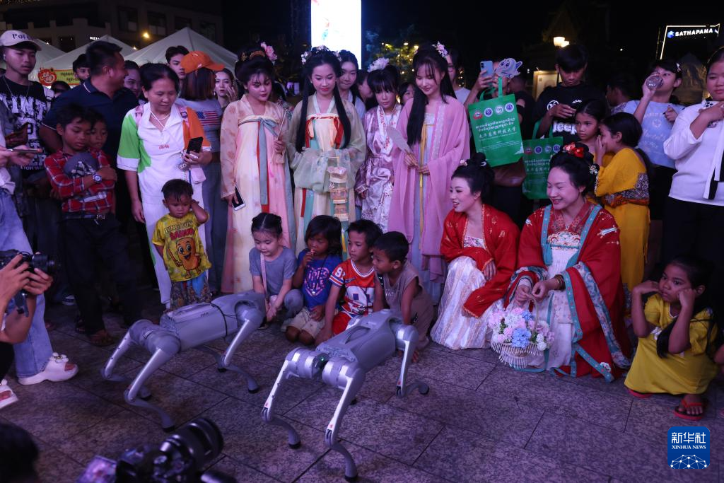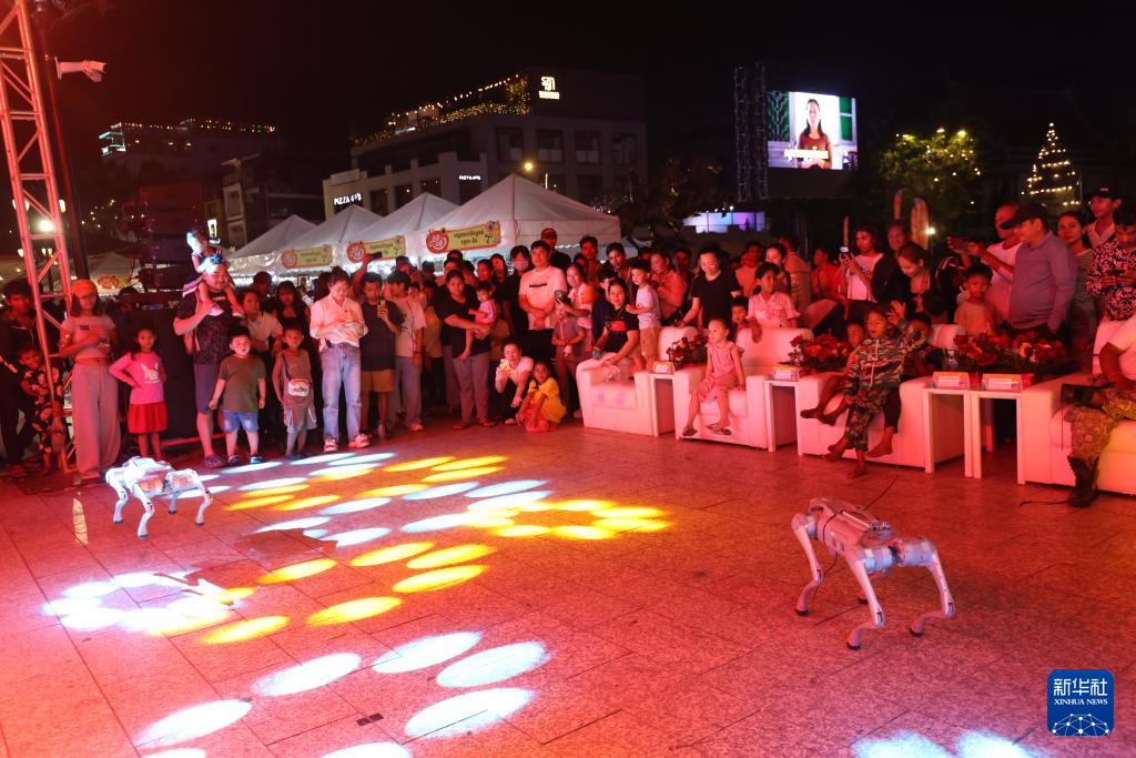 文化市集活动现场气氛热烈,非遗、美食、科技等多个中柬文化展位集中展示,各式文创产品琳琅满目。中国舞狮、柬埔寨仙女舞等表演引来当地民众阵阵掌声,现场观众纷纷驻足拍照、互动。来自中国的机器狗、数字IP驼小驼智能玩偶等科技产品为当地民众带去新奇体验。