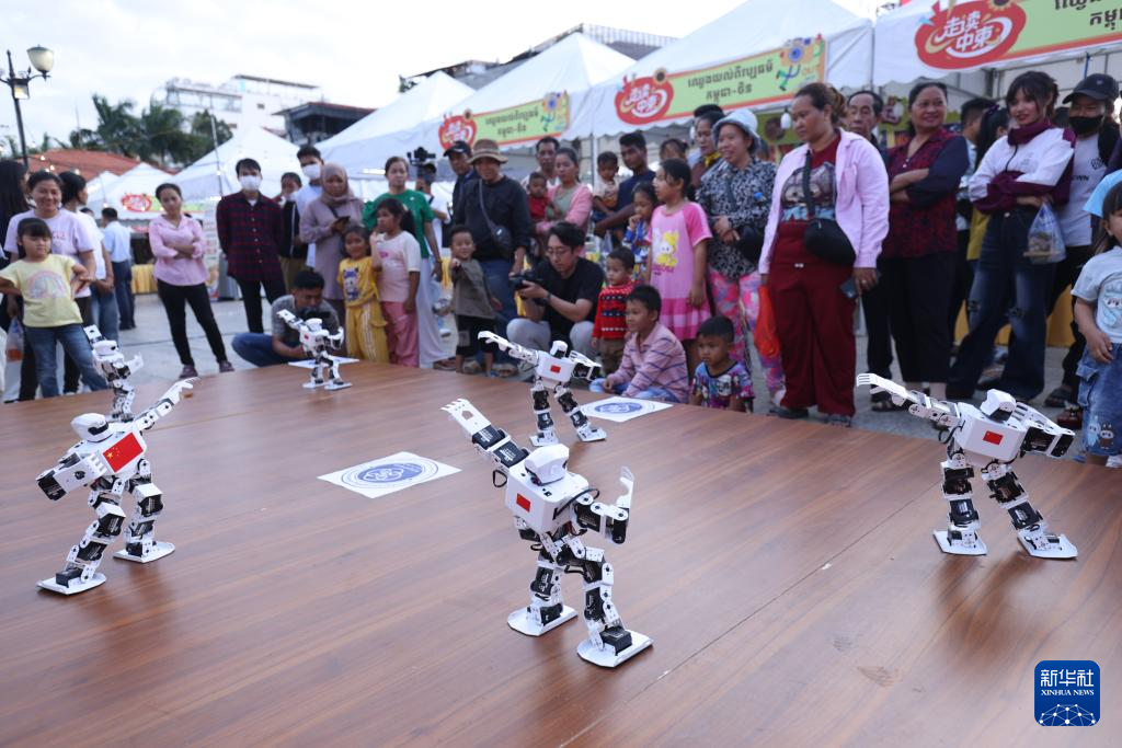 12月14日,在柬埔寨金边,人们在“走读中柬”系列文化活动文化市集上观看机器人表演。新华社发(萨雷摄)
