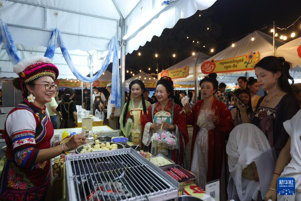 12月14日,在柬埔寨金边,人们在“走读中柬”系列文化活动文化市集上体验中国美食。新华社发(萨雷摄)