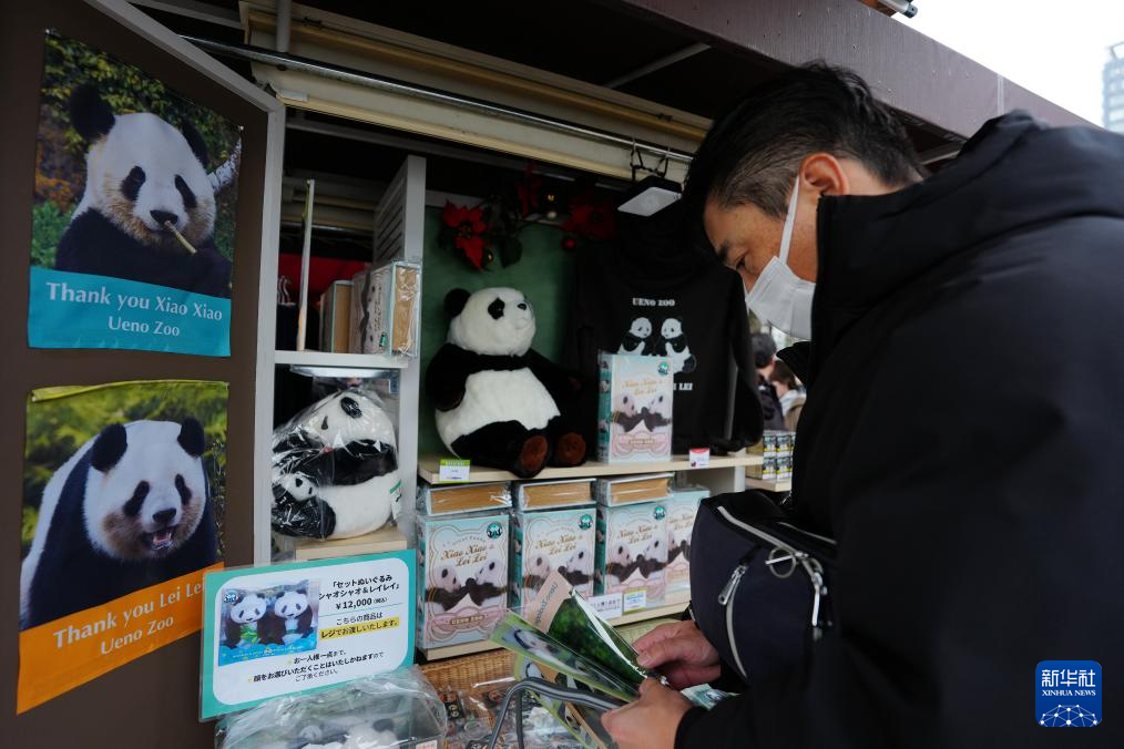 2025年12月25日,在日本东京的上野动物园,游客选购大熊猫“晓晓”和“蕾蕾”的纪念商品。