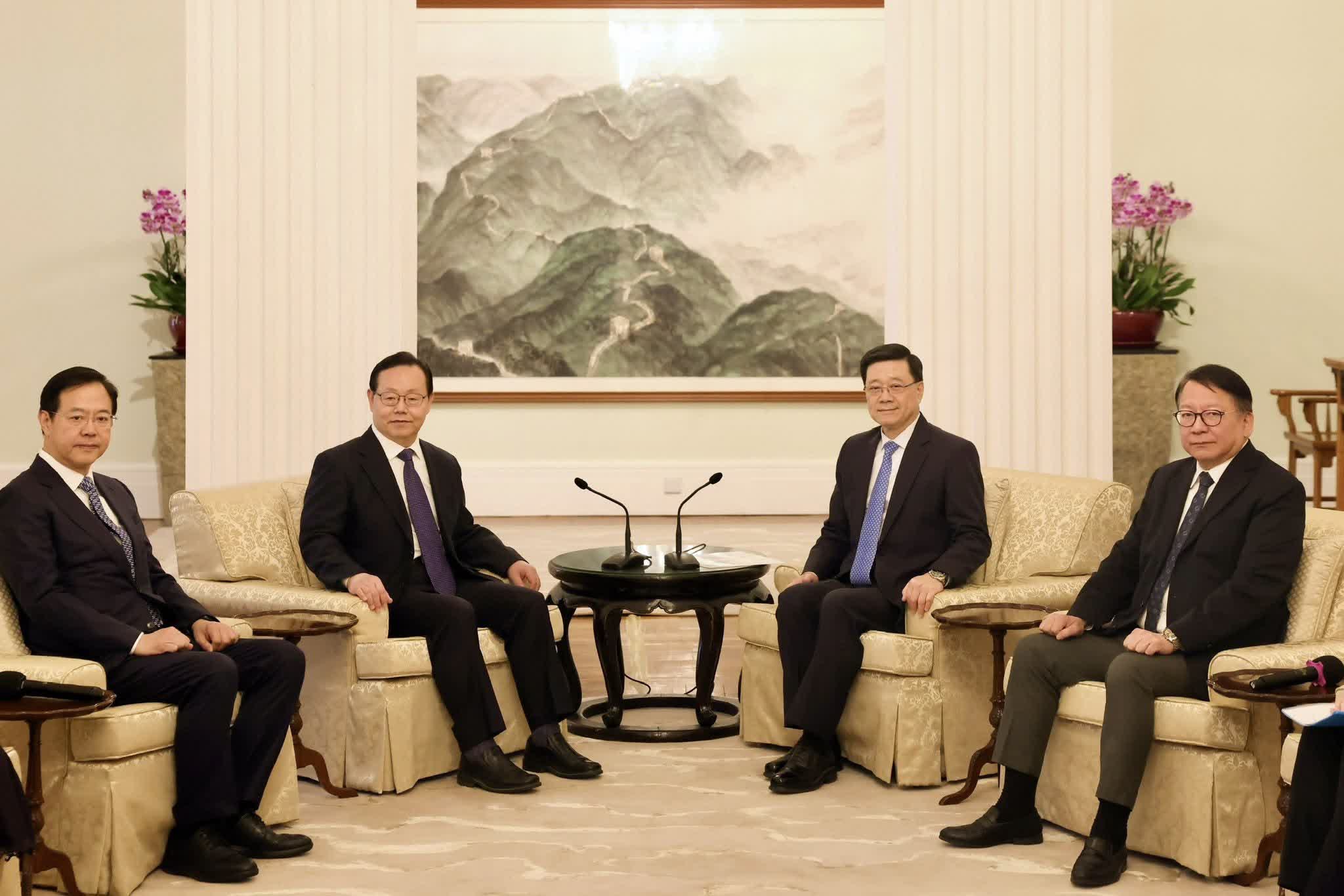 今日,行政長官李家超表示,下午在禮賓府與全國政協副主席、致公黨中央主席蔣作君會面,就共同關心的議題交換意見,政務司司長陳國基和政制及內地事務局副局長胡健民亦有出席。